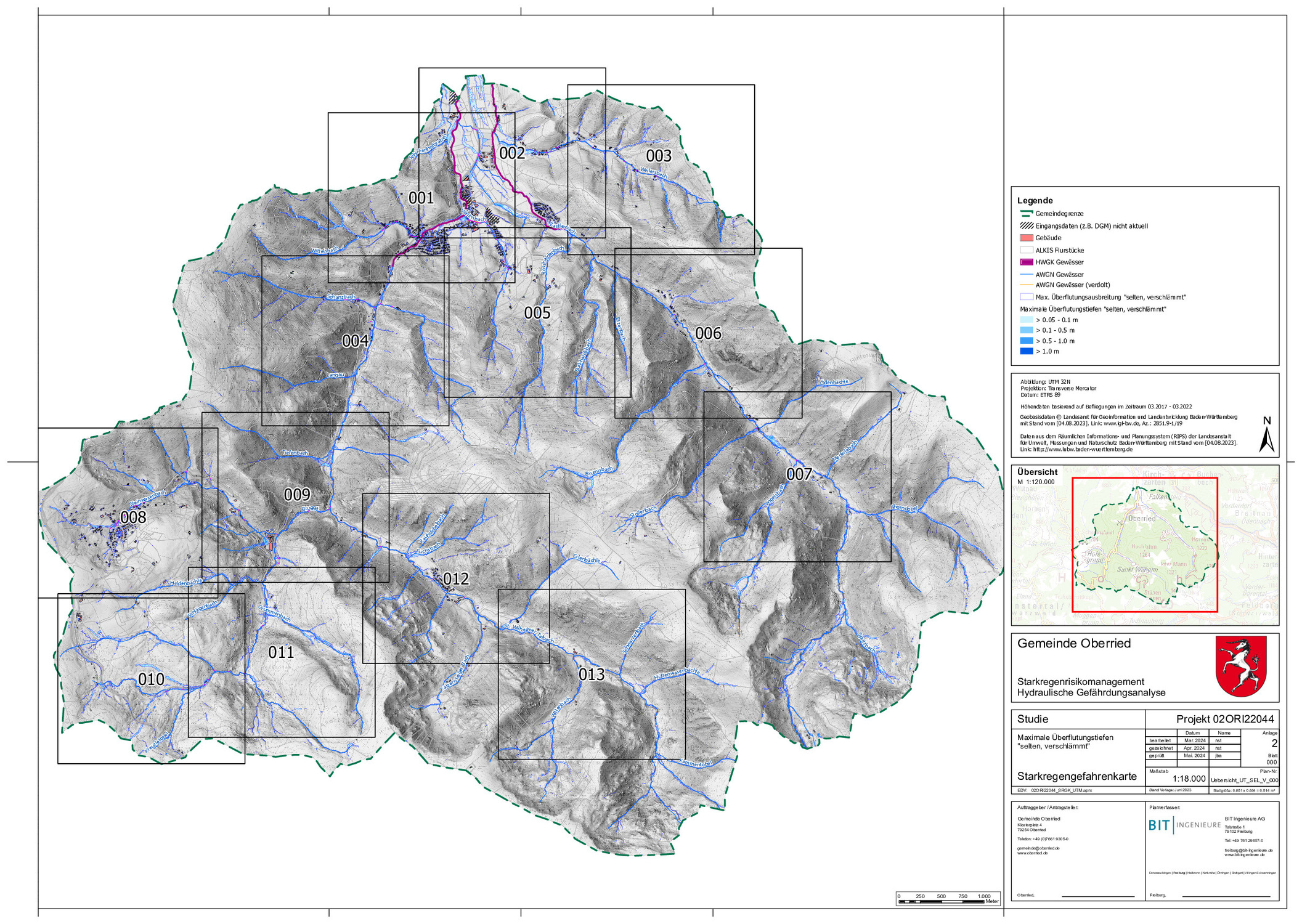 Ein wichtiges Element des Starkregenrisikomanagements ist die Information der Öffentlichkeit in Form der Bereitstellung von Karten, die anhand des Leitfadens des Landes Baden-Württemberg zum Kommunalen Starkregenrisikomanagement erstellt wurden. Diese zeigen die errechneten Überflutungstiefen und Strömungsgeschwindigkeiten für die Gemarkung.
