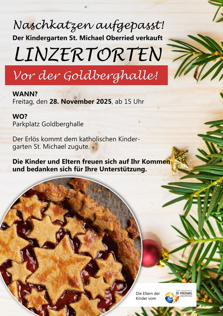 Hinweis zum Wochenmarkt – Verlegung aufgrund der Baustelle Hauptstraße! Aufgrund der aktuellen Situation rund um die Baustelle in der Hauptstraße findet der Wochenmarkt nochmals auf dem Parkplatz der Goldberghalle statt. Die Eltern des Kindergartens St. Michael Oberried werden dort ebenfalls anwesend sein und eingepackte Linzertorten zum Mitnehmen verkaufen. Der gesamte Erlös kommt dem Kindergarten zugute.